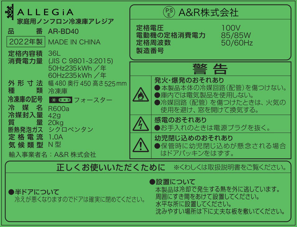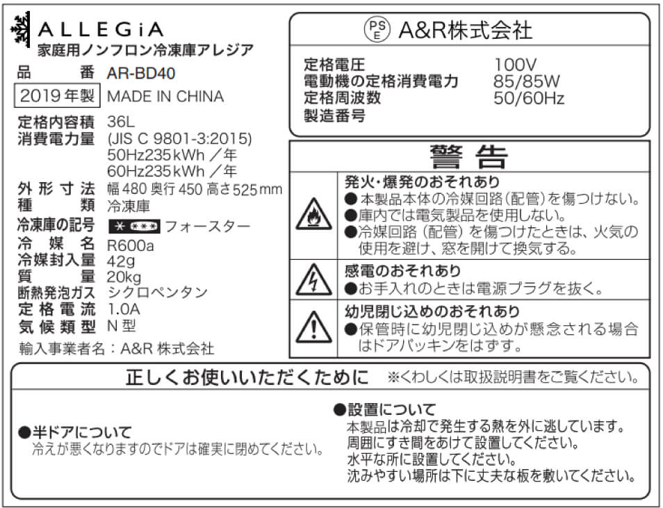 AR-BD40-NW 取扱説明書と定格ラベルについてのご案内